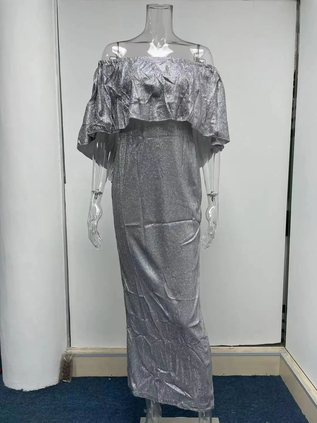 Vestido de noite estilo 2025, com decote de um ombro só, grandes folhos na base, atilhos no busto e racha lateral com detalhes brilhantes.
