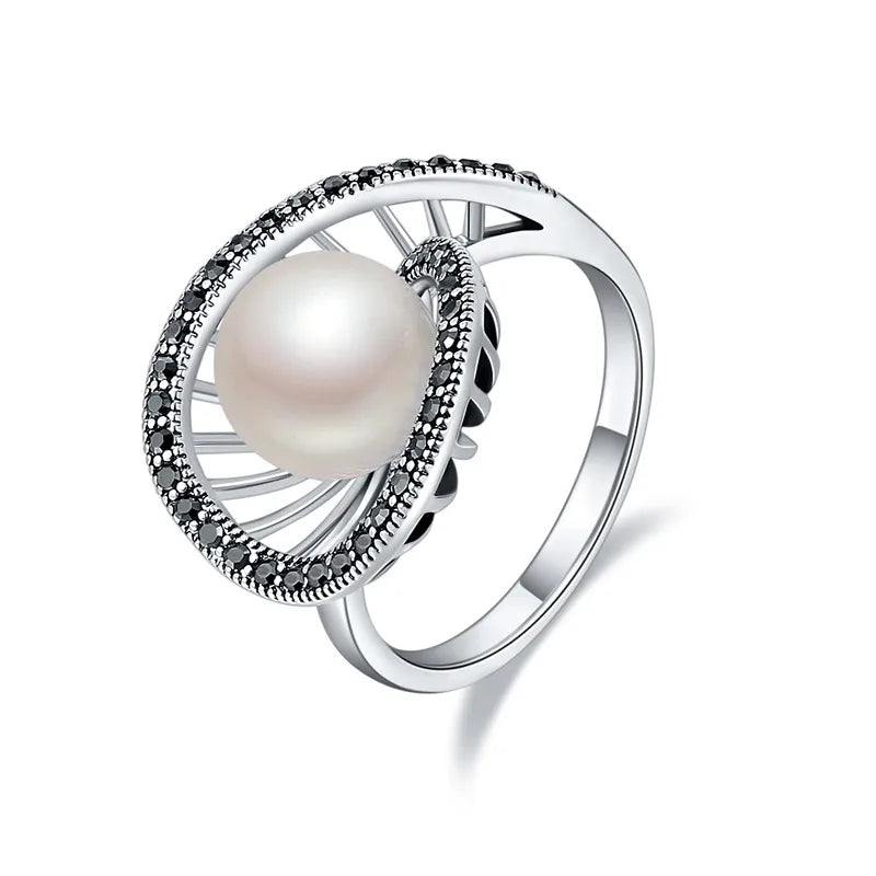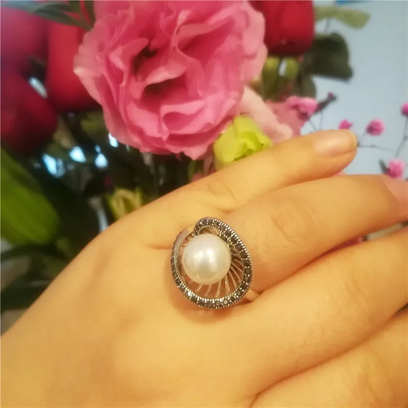 Anel geométrico vazado com pérola branca, estilo vintage, com strass pretos, joalharia retro, acessórios antigos.