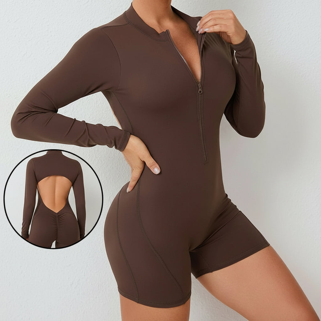 Macacão desportivo com meio fecho, respirável, com decote em V nas costas e efeito levanta o rabo. Ideal para atividades ao ar livre.