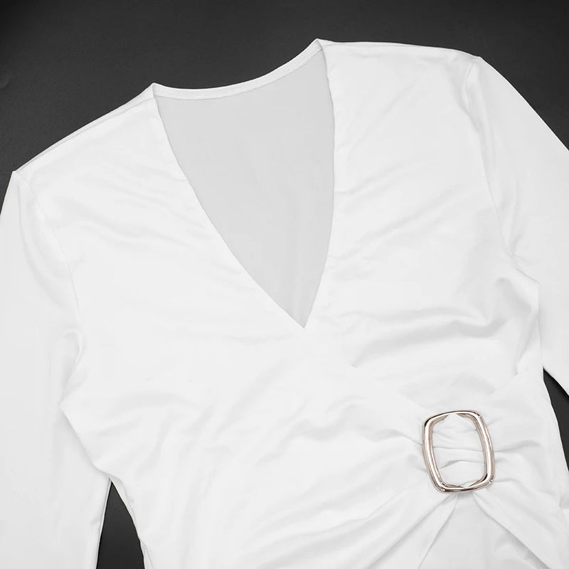 T-Shirt Lisa para Mulher com Decote em V Profundo, Manga Longa Assimétrica, Sexy e Elegante - Top Casual Minimalista