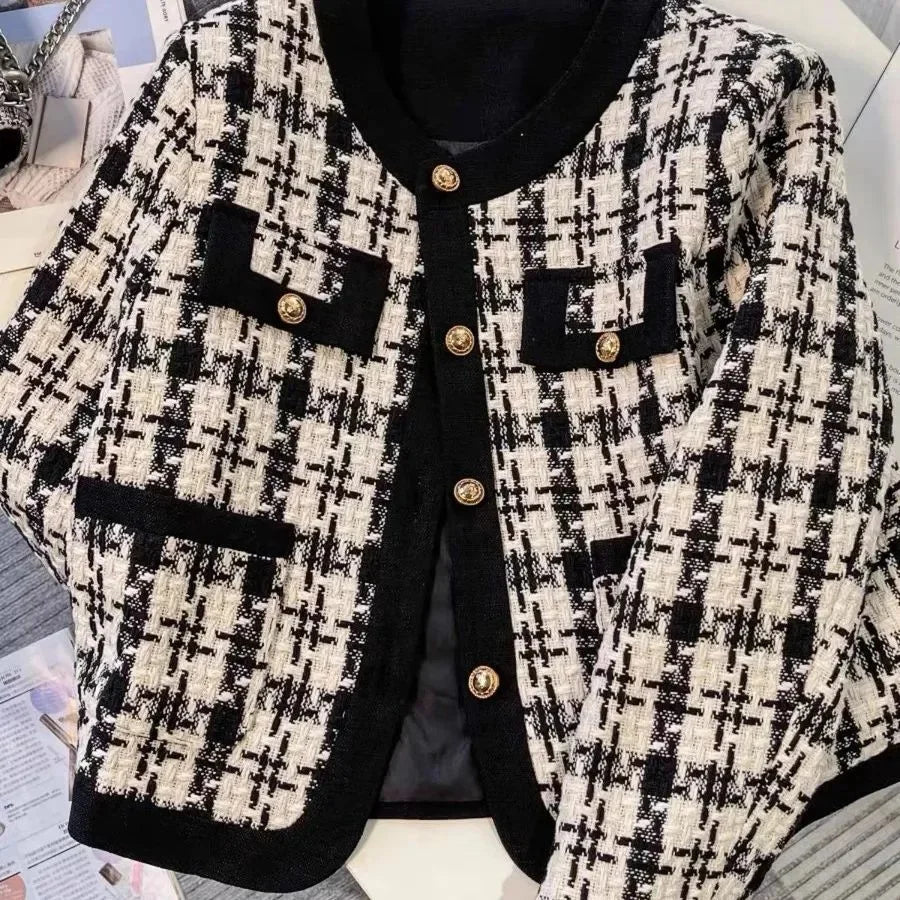 Casaco curto estilo francês para outono/inverno, nova versão coreana, elegante, mulher, tamanho pequeno, xadrez, blusa curta, casaco de mulher de corte largo.
