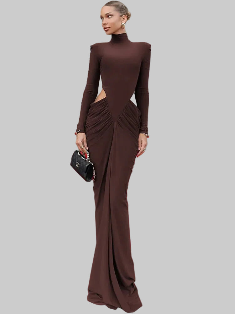 Vestido comprido sexy de gola alta e manga comprida Mozision para mulher, elegante, para o outono e inverno, com detalhes vazados e franzidos, perfeito para festas e saídas à noite.